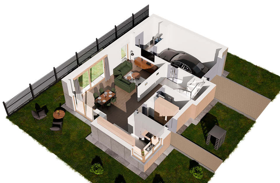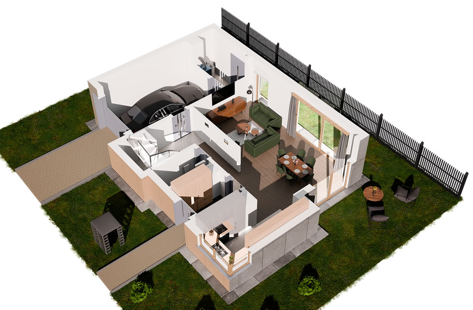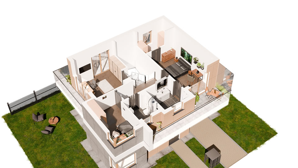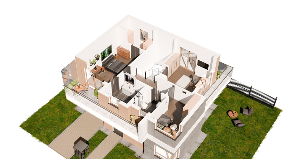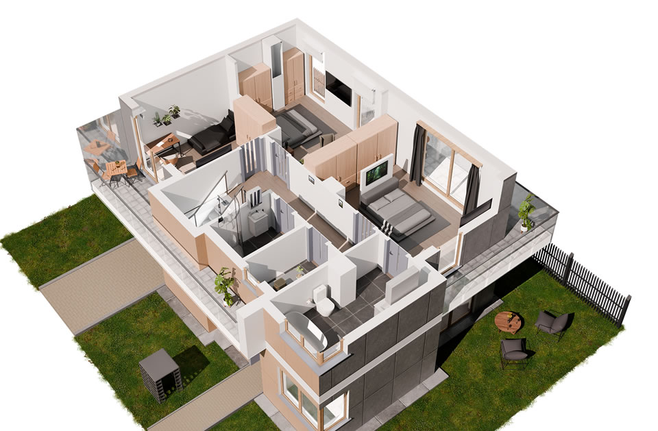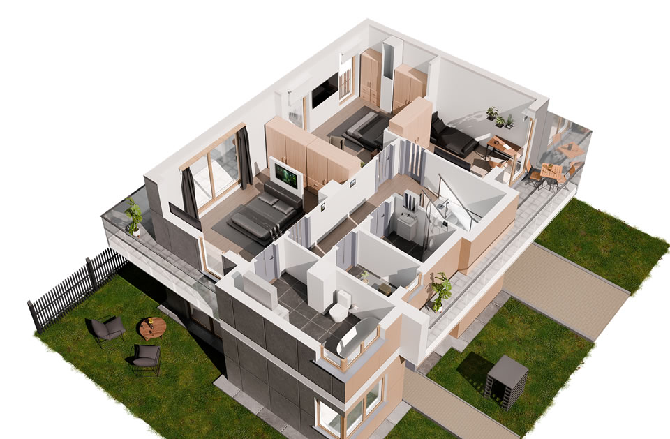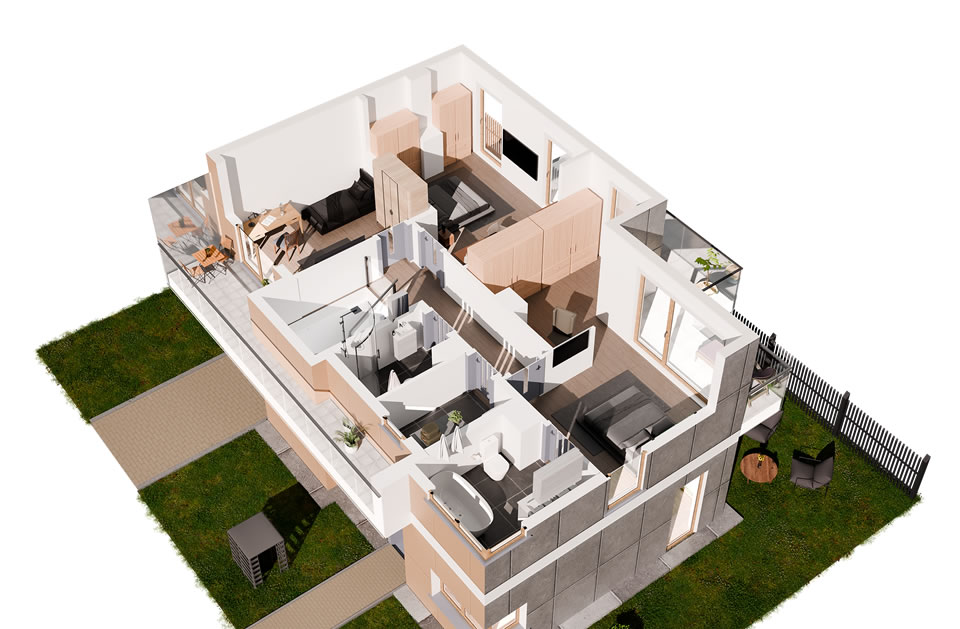Jeziorowa Prestige House to domy w wariantach A, B, C, D, różniących się wielością i ilością pomieszczeń. Każdy wariant występuje w wersji „lewej” i „prawej” (oznaczonych 1 i 2) będących swoim lustrzanym odbiciem.