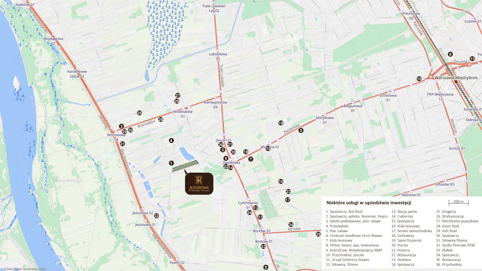 W sąsiedztwie znajdują się sklepy, szkoła podstawowa, usługi, sieć komunikacji miejskiej. W pobliżu stacji Międzylesie znajduje się duże centrum handlowe Ferio Wawer. Szczegółową informację na temat aktualnej sieci punktów handlowych, usługowych i infrastruktury okolicy można znaleźć na mapach Google i OSM. Próbki przedstawiamy na mapie.